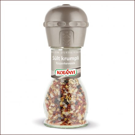 "A Kotányi Sült krumpli fűszermalommal nemcsak a sült krumplit fűszerezhetjük, hanem a tepsis burgonyát és más burgonyás ételt is. A termék gluténtartalmú gabonaféléket, tojást, tejet (laktóz), zellert, szóját, mustárt és szezámmagot is felhasználó gyártóüzemben készült. Száraz helyen tartandó. Összetevők: jódozott tengeri só (tengeri só, kálium-jodát), paprika, fokhagyma, görögszéna, vöröshagyma, bors. Tápértéktartalom