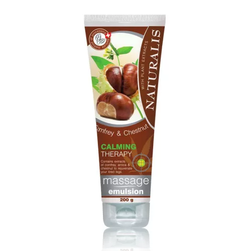 A Naturalis nyugtató masszázskrém kimondottan a fáradt, elnehezedett lábak esetén ajánlott. Az árnika, a nadálytő és a gesztenye kombinációja hatékonyan frissíti fel a lábakat, ha azok az egész napos állás vagy járás miatt elfáradtnak, elnehezedtek. Mélyen behatol a bőr rétegeibe. Gyorsan beszívódik, hosszan tartó hatással bír.  Természetes növényi eredetű összetevőket tartalmazó vegán, állatkísérlet-mentes termék. Használat: A kívánt mennyiségű krémet vigye fel a kezelendő bőrfelületre, majd körkörös mozdulatokkal masszírozza bele a bőrébe. Szükség esetén ismételje meg. Figyelem! Érzékeny vagy sérült bőrfelületen ne használja! Külsőleg használja! A termék használata 3 éves kor alatt nem javasolt!