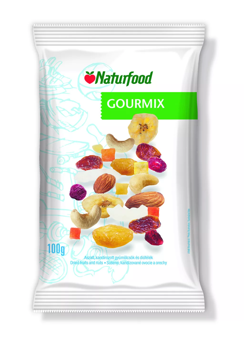 Összetevők: Mazsola (mazsola, napraforgó olaj), mandulabél, banán chips (banán, cukor, kókuszolaj, méz, aroma), kandírozott ananász (ananász, cukor, étkezési sav (citromsav), antioxidáns (kén-dioxid)), kandírozott papaya (papaya, cukor, antioxidáns (kén-dioxid)), aszalt, édesített vörös áfonya (vörös áfonya, cukor, napraforgó olaj), arany mazsola (mazsola, napraforgó olaj, antioxidáns (kén-dioxid)), kesudió, kókusz chips