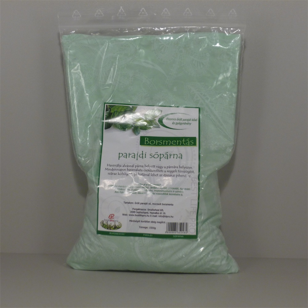 Használja alvásnál párna helyett vagy a párnára helyezve. Mindennapos használata csökkentheti a reggeli tüsszögést, száraz köhögést, jó hatással lehet az éjszakai pihenésre. Mire jó a borsmenta? Erőteljes mentolos illata hűsítő hatású. Javítja a légzést, görcsoldó, hurutoldó, antimikrobiális. Fejfájás enyhítésére is ajánlott. Kedélyjavító, frissítő, élénkítő. Utazási rosszullétek kezelésére is. Finomra őrölt parajdi kősót és borsmenta levelet tartalmaz. Használata 2 év alatti gyermekeknek és terhes nőknek nem ajánlott!